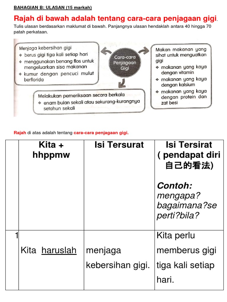 Senarai Contoh Ulasan PT3 dan Tips Terbaik untuk format menulis Pastikan anda. Gosok gigi sekurang-kurangnya tiga kali setiap hari. Akhirnya gigi rosak pada peringkat usia yang masih mudaOleh itu marilah kita belajar cara menjaga kesihatan Gigi kita dengan selamat.